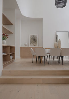 Beautiful dining space with banquet seating under a feature arch and double height void, flooding the open plan area with natural light.